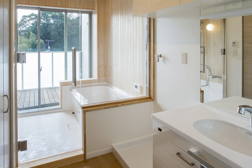 洗濯室と浴室とテラス 浴室の壁は壁はヒノキ板無節 洗面は外光が充分で明るい ツーボウルを採用